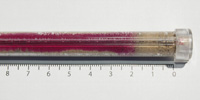 PHASE 4 – ANALYSIS WITH PHENOLPHTHALEIN Once the measuring has been carried out, the picker is taken out from the collecting device. Using the pipette, take some phenolphthalein from the bottle and lay a thin layer of it along the flared longitudinal cut on the picker so the liquid can penetrate into the powder of the sample. The chemical reaction of the indicator takes place instantly. Carbonatated concrete does not change its colour, while the concrete which has not yet been affected by carbonation takes on a typical magenta red hue. |